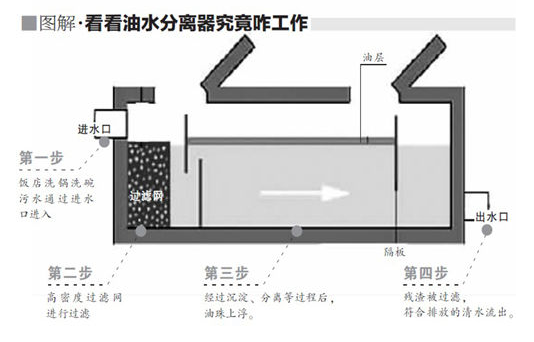 油水分離器究竟是如何工作的?其實原理非常簡單,就是利用了“油和水密度不同”的物理原理。油水通過灶臺下水管道進入油水分離器后,密度小的浮在上面、密度大沉在水底,經過油水分離器的雜質初濾箱和兩層復濾箱過濾分離,能自動將廢水中的油、渣、水分開。因為污油、廢棄物都被截留,排入下水道的則是廢棄污水,經過設備處理的廢水基本不含油,這樣既避免下水道堵塞,還減少污染。